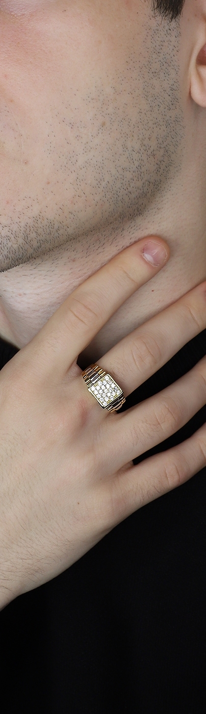 Bague élégante et moderne pour homme, en or blanc et jaune 18k, sertie de zircones étincelantes. Un design raffiné qui allie classicisme et originalité.