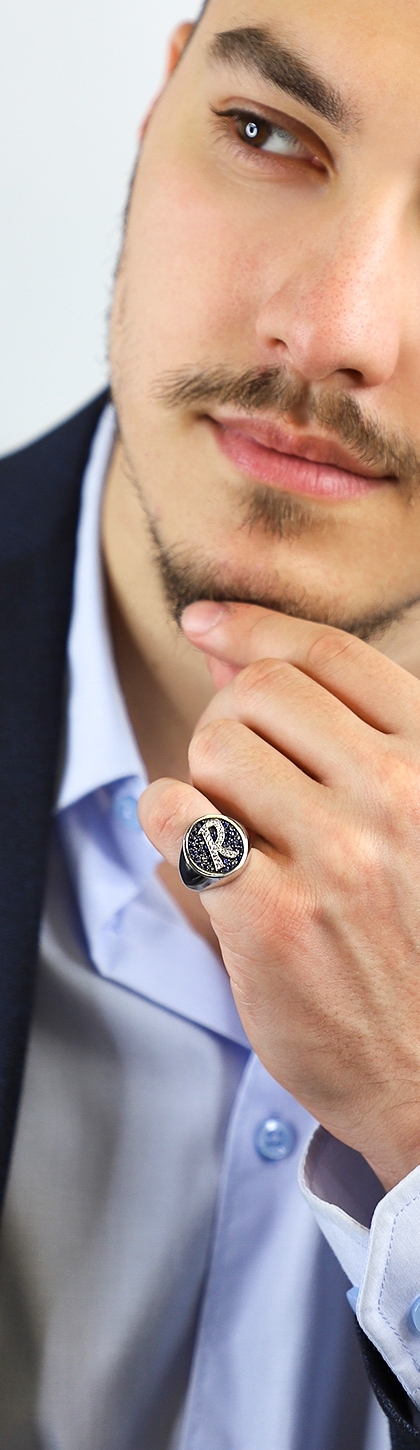Bague pavé lettre R en or blanc 18ct diamants et saphirs bleus
