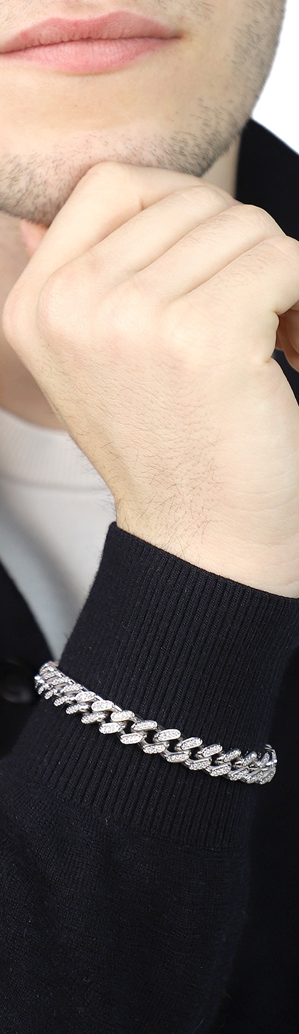 Bracelet Cuban Link en or blanc 18k serti de diamants taille brillant, couleur H et pureté Vs. Épaisseur 9 mm, longueur 20 cm. Un bijou audacieux, élégant et lumineux.