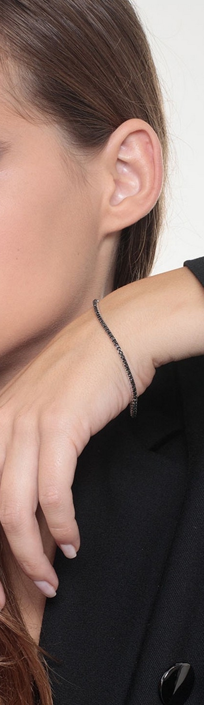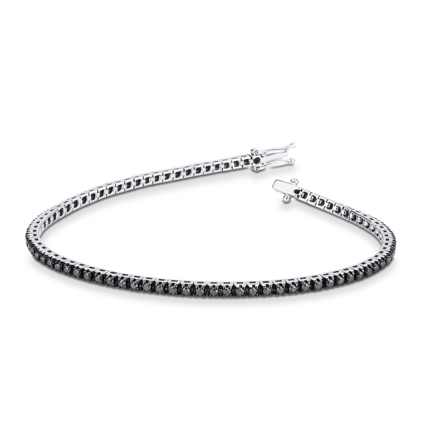Bracelet tennis en or blanc 18k serti de diamants noirs taille brillant sur griffes brunies. La carature peut varier selon la taille du bracelet. Largeur d’environ 2,05 mm.