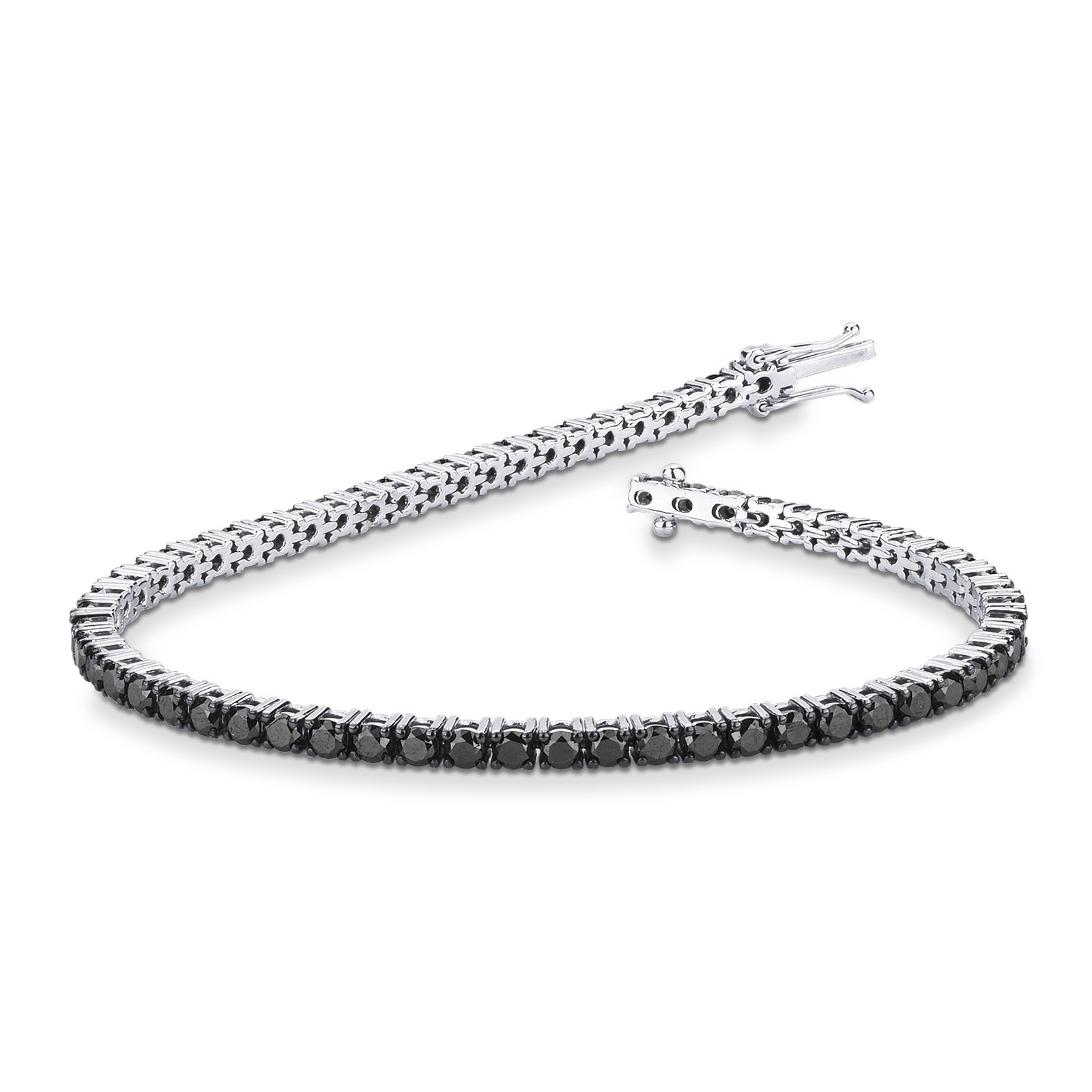 Bracelet tennis en or blanc 18k serti de diamants noirs taille brillant sur griffes brunies. La carature peut varier selon la taille du bracelet. Largeur du maillon d’environ 3 mm.