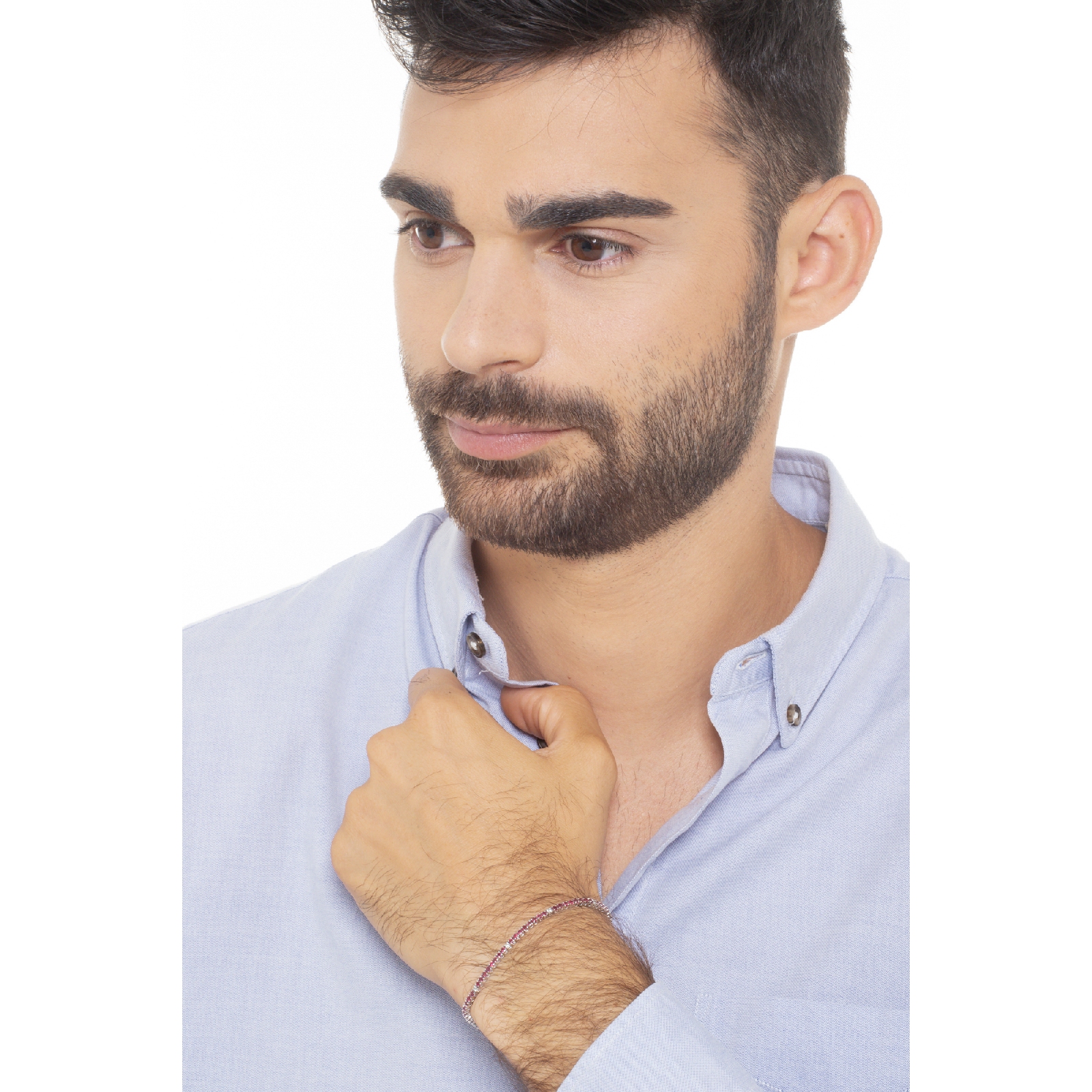 Bracelet en or blanc 18 carats, serti de rubis et de diamants taille brillant. Le caratage peut varier selon la longueur du bracelet. Largeur : environ 2,20 mm. Une création lumineuse et élégante, alliant la vivacité des rubis à l’éclat des diamants.