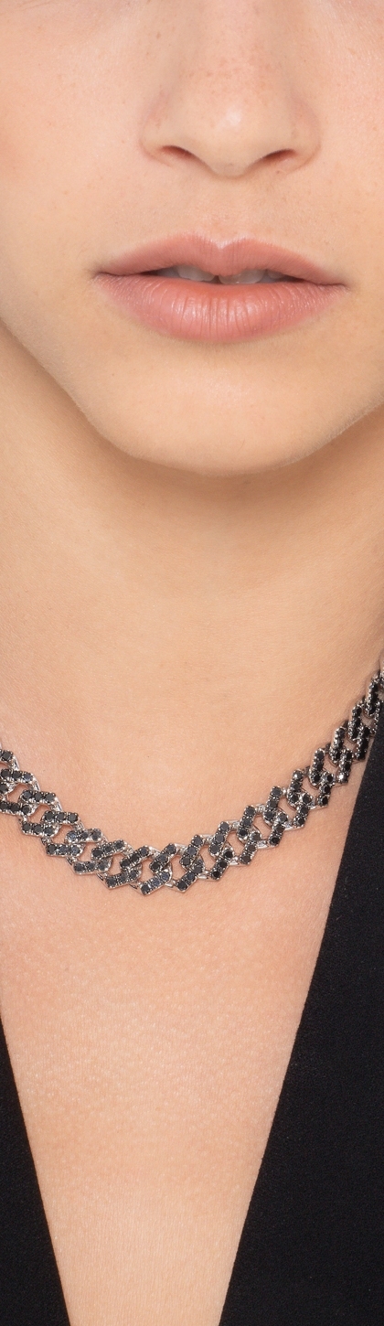 Collier en maille gourmette en or blanc 18 carats avec des diamants noirs. Extrémités brunies.