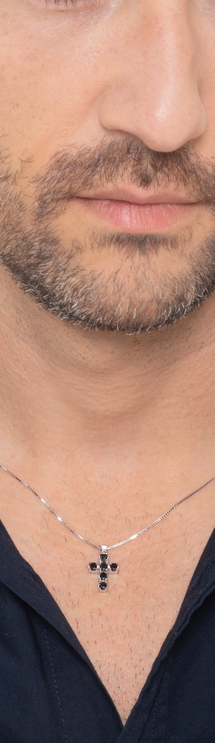 Collier en or blanc 18k avec croix en diamants noirs 50 cm