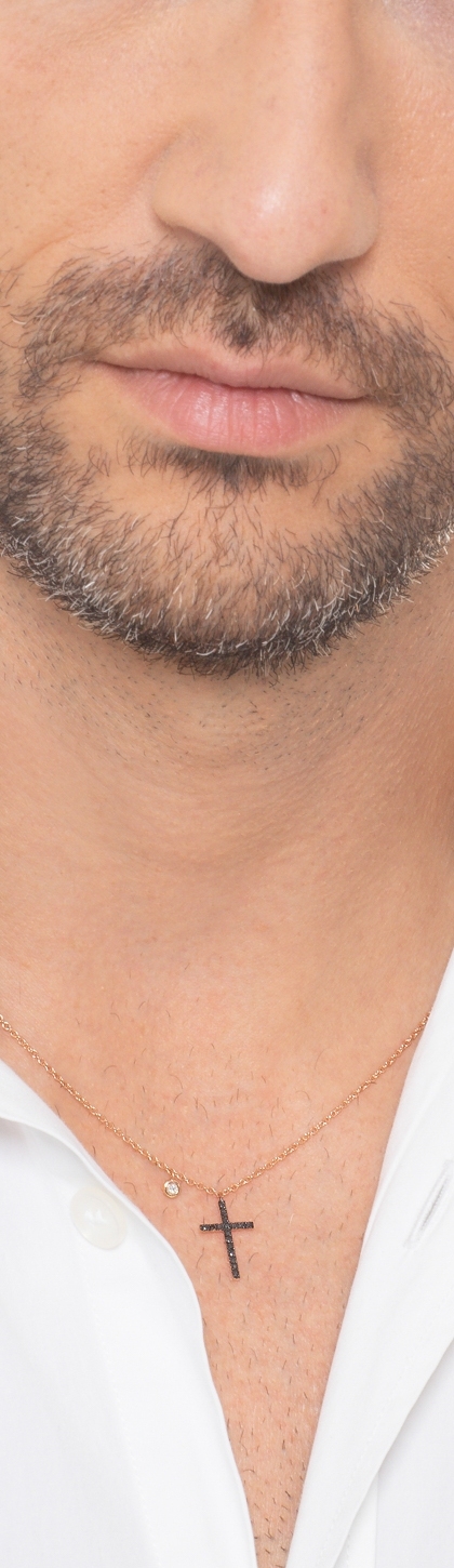 Collier en or rose 18k avec croix orné de diamants noirs et d'un diamant