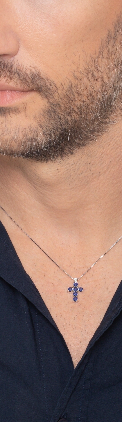 Pendentif en croix en or blanc 18 carats orné de saphirs bleus