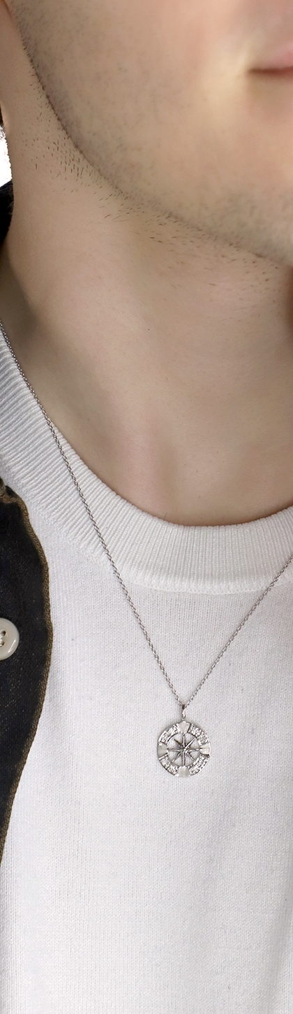 Collier en or blanc 18 carats avec pendentif rose des vents et diamants