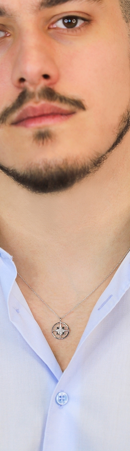 Collier en or blanc 18k avec pendentif rose des vents de diamants
