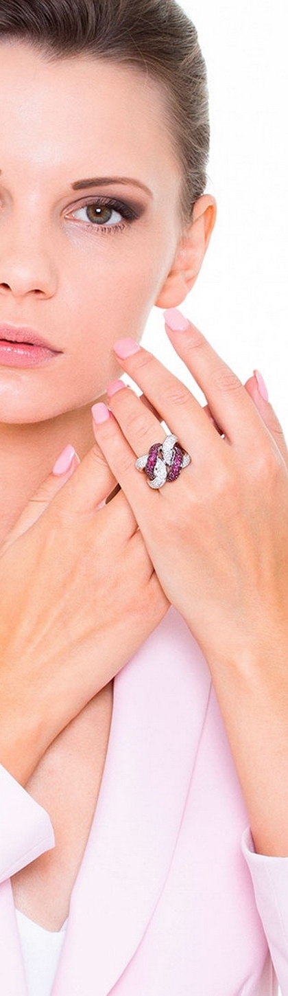 Bague nœud gourmette Or Blanc 18k avec diamants et rubis
