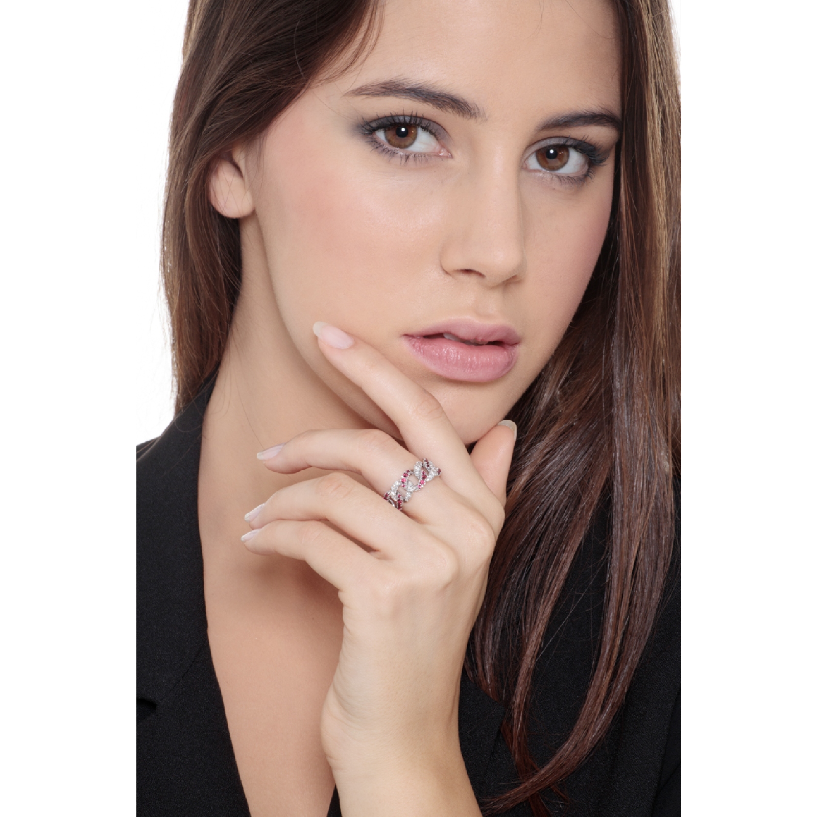 Élégante bague gourmette en or blanc 18K composée de 8 maillons sertis de rubis et diamants brillants H VS, au confort parfait sur le doigt.