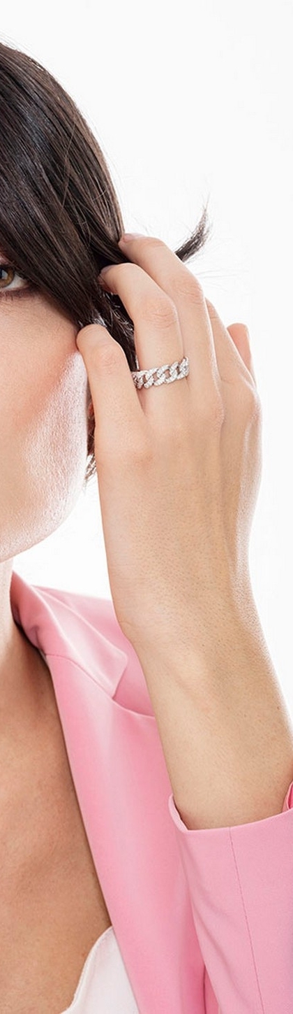Bague souple style gourmette en or blanc 18k avec diamants sertis taille brillant, couleur H et pureté VS. La bague est composée de 10 maillons qui s’ajustent parfaitement.