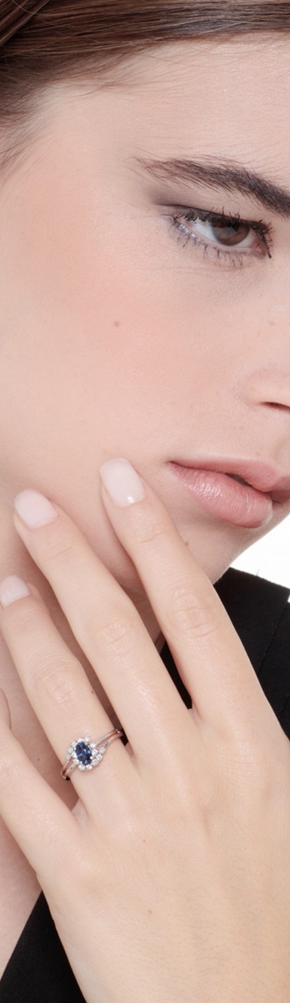 Bague avec diamants et saphir bleu ovale central en or blanc 18k