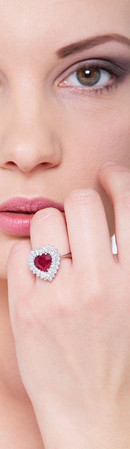 Bague avec rubis en forme de cœur à double rangée de diamants