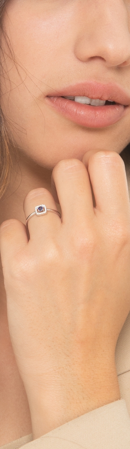 Bague en or blanc 18 carats avec saphir bleu central et contour en diamants