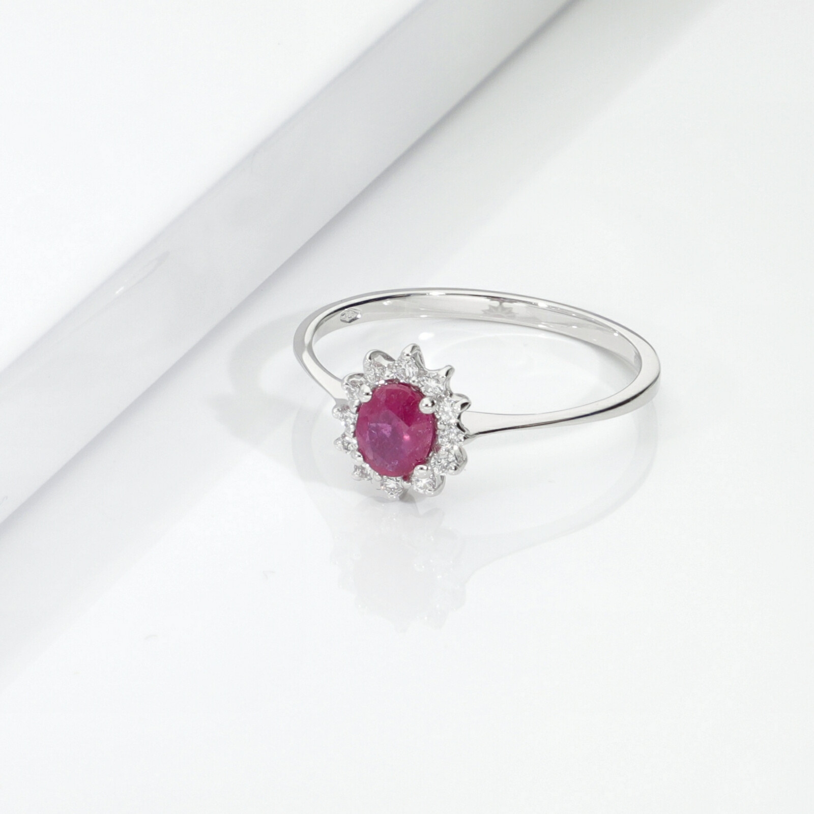 Élégante bague en or blanc 18k avec rubis ovale de 5x4 mm au centre, entouré de diamants taille brillant, couleur H, pureté VS. Un bijou raffiné et lumineux, parfait pour toutes les occasions.