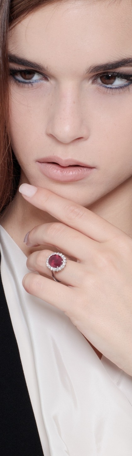 Bague en or blanc 18k avec rubis ovale et halo de diamants