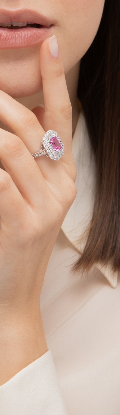 Bague en or blanc 18k avec saphir rose rectangulaire et diamants