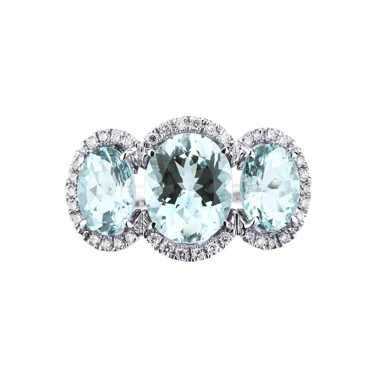 Élégante bague en or blanc 18k avec trois aigue-marines taille ovale entourées de diamants taille brillante couleur H pureté Vs, idéale pour offrir ou porter lors d’occasions spéciales