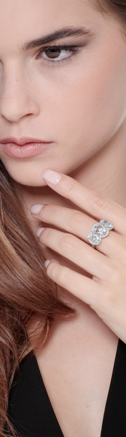 Bague en or blanc 18k avec trois aigue-marines et diamants