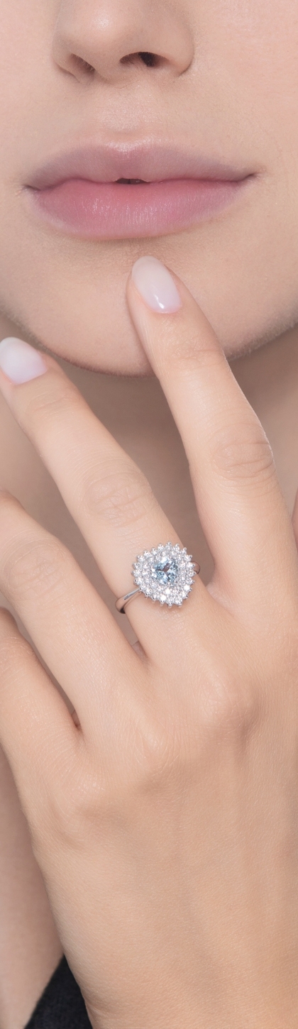 Bague en or blanc 18k ornée d’une sublime aigue-marine et halo diamants