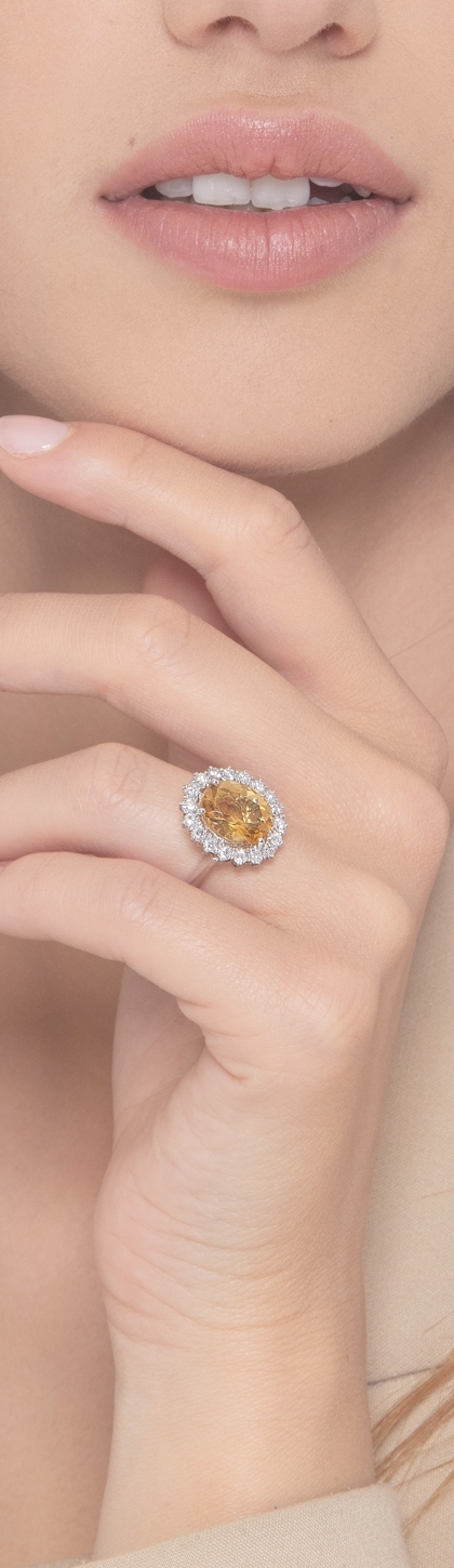Eclat solaire et raffinement. Cette bague en or blanc 18 carats est ornee d’une citrine taille ovale d’environ 12x10 mm, mise en valeur par des diamants taille brillant, couleur H et purete VS. Un bijou lumineux qui allie chaleur et elegance.