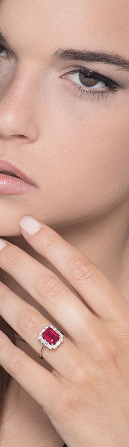Bague entourage en or blanc 18k élégante et raffinée, sertie d’un rubis taille octogonale d’environ 7x9 mm entouré de diamants taille brillant couleur H pureté VS, avec un serti panier en fil