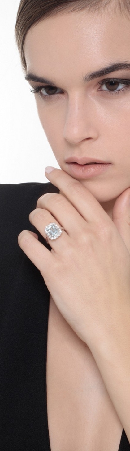 Bague halo diamants en or blanc 18k avec aigue-marine 9x7 mm