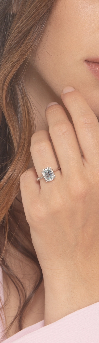 Bague halo en or blanc 18 carats avec aquamarine