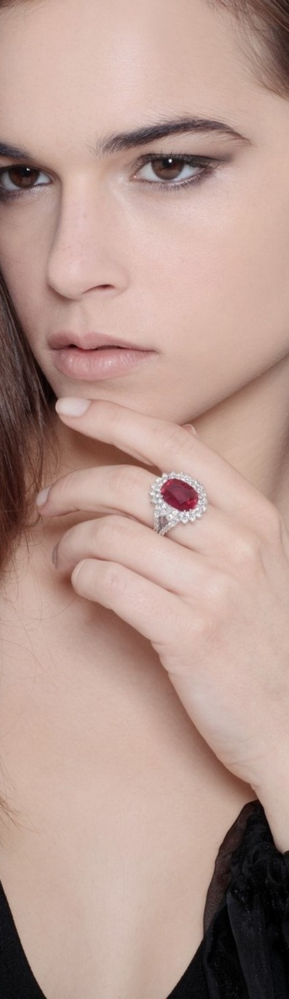 Bague en or blanc 18k classique et intemporelle avec rubis ovale central de 14x12 mm au centre, entouré d’un double halo de diamants taille brillant couleur H et pureté VS. Deux rangées de diamants sertis sur le corps complètent l’élégance de la bague. Parfaite comme bague de mariage ou bijou de cocktail pour soirées élégantes, offrant un éclat exceptionnel à chaque mouvement.
