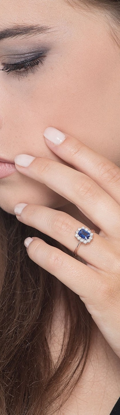Bague halo en or blanc 18k avec saphir bleu octogonal