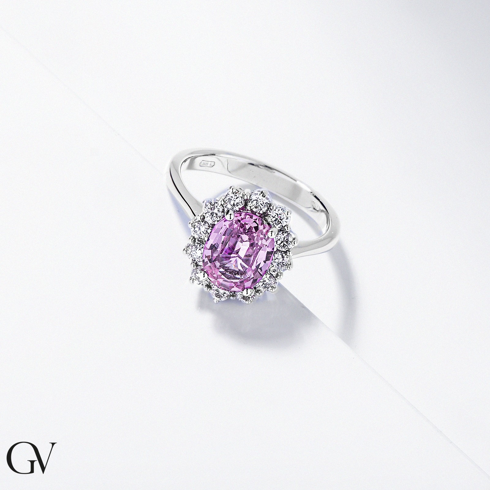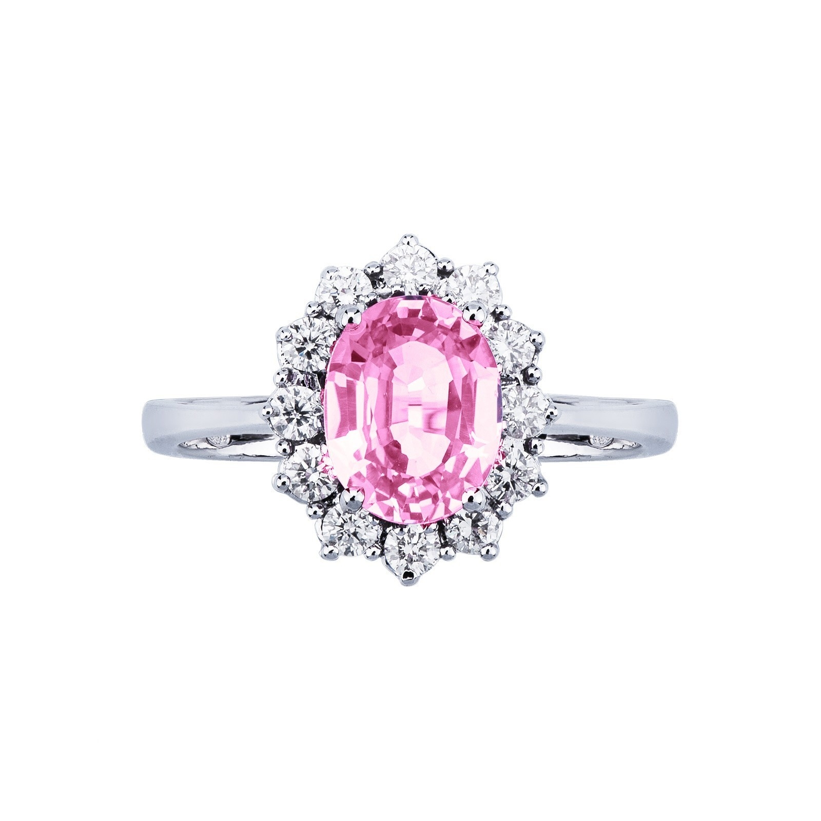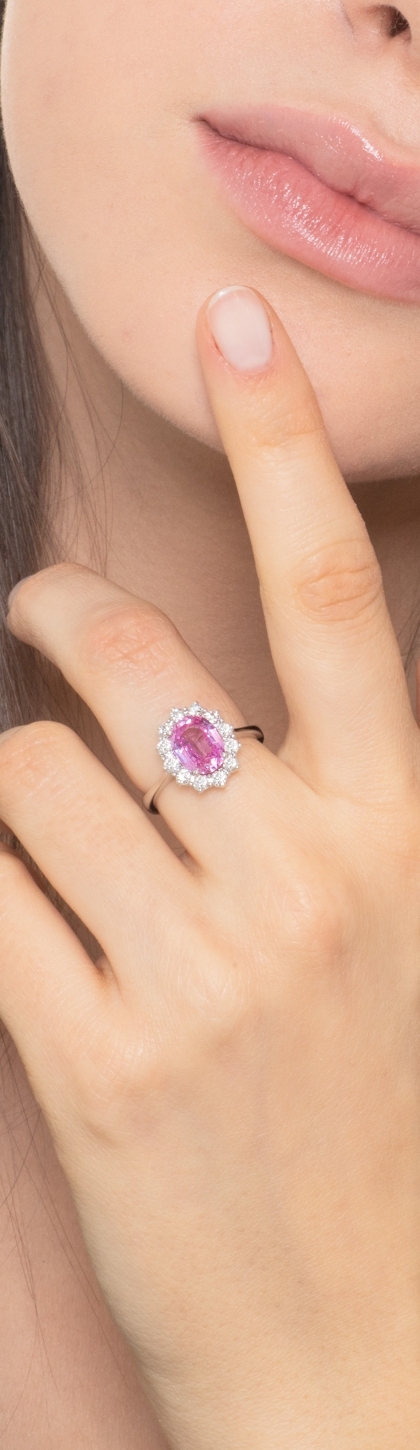 Bague halo en or blanc 18k avec saphir rose et diamants