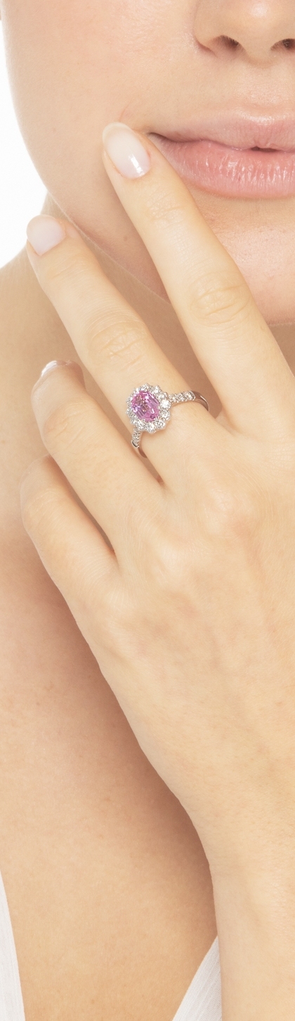 Bague halo en or blanc 18k avec saphir rose ovale et diamants