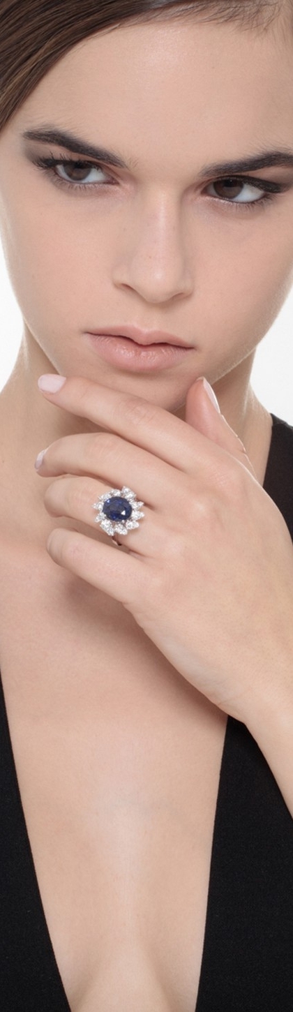 Bague halo en or blanc 18k sertie d’un saphir bleu taille ovale de 12x9 mm, entouré de diamants taille brillant de couleur H et pureté VS. Les diamants sont sertis par paires sur les dix rayons, offrant une brillance exceptionnelle.