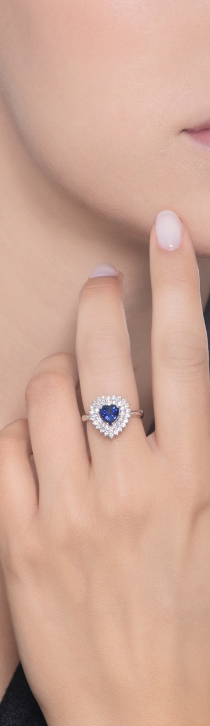 Bague halo en or blanc 18k sertie d’un somptueux saphir cœur