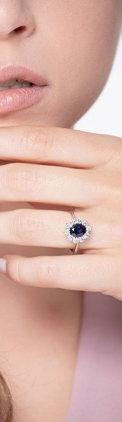 Bague halo en or blanc 750 avec saphir bleu et diamants