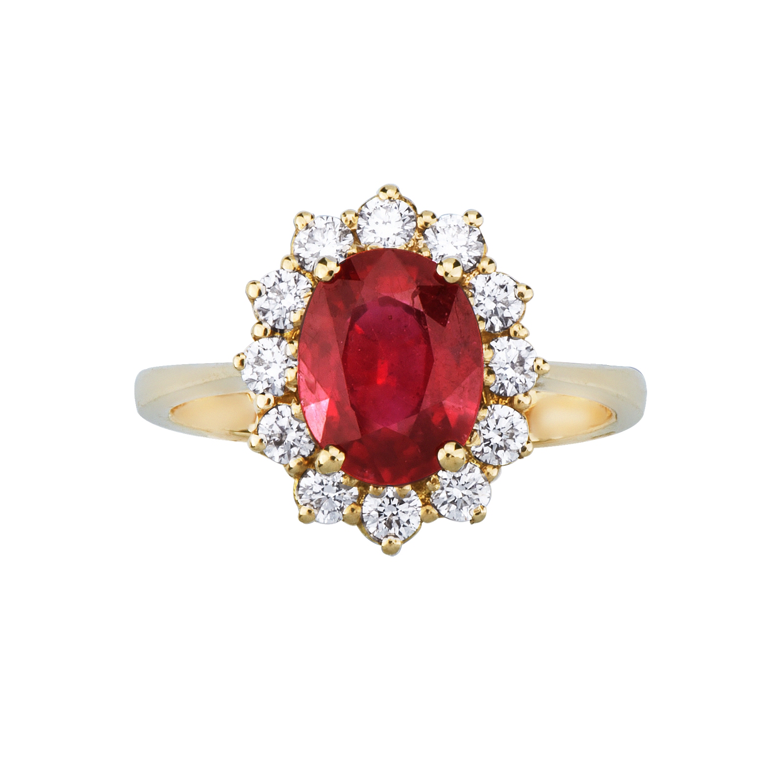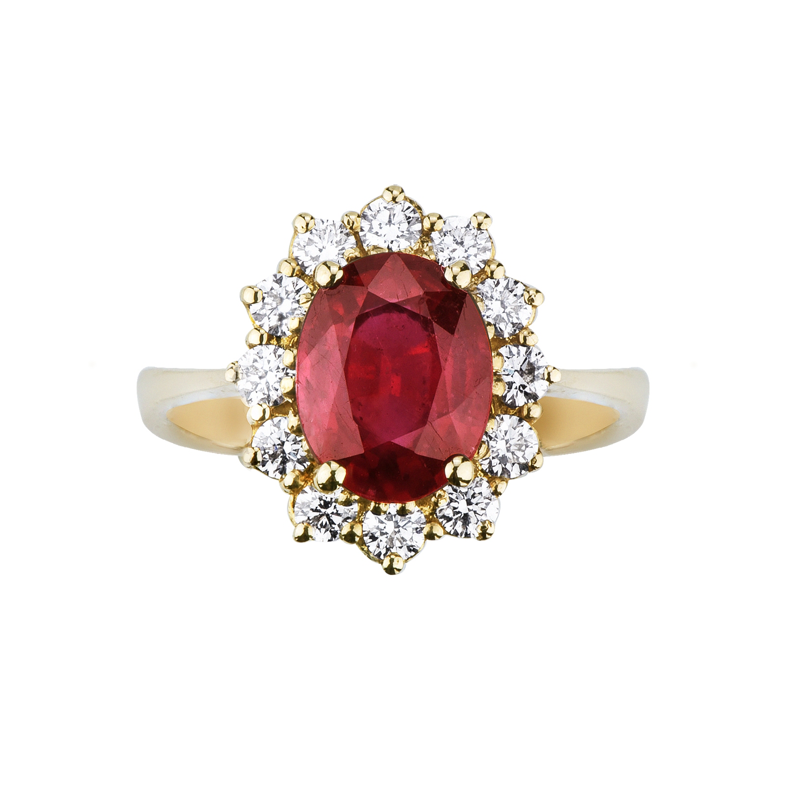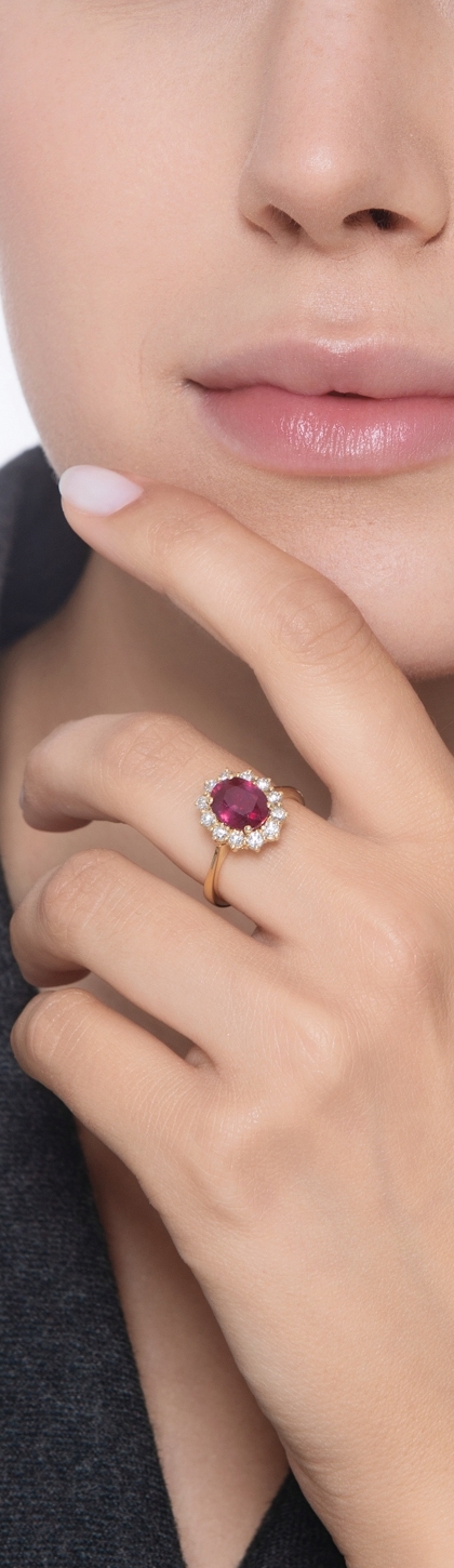 Bague halo femme en or jaune 18 carats avec rubis ovale et diamants