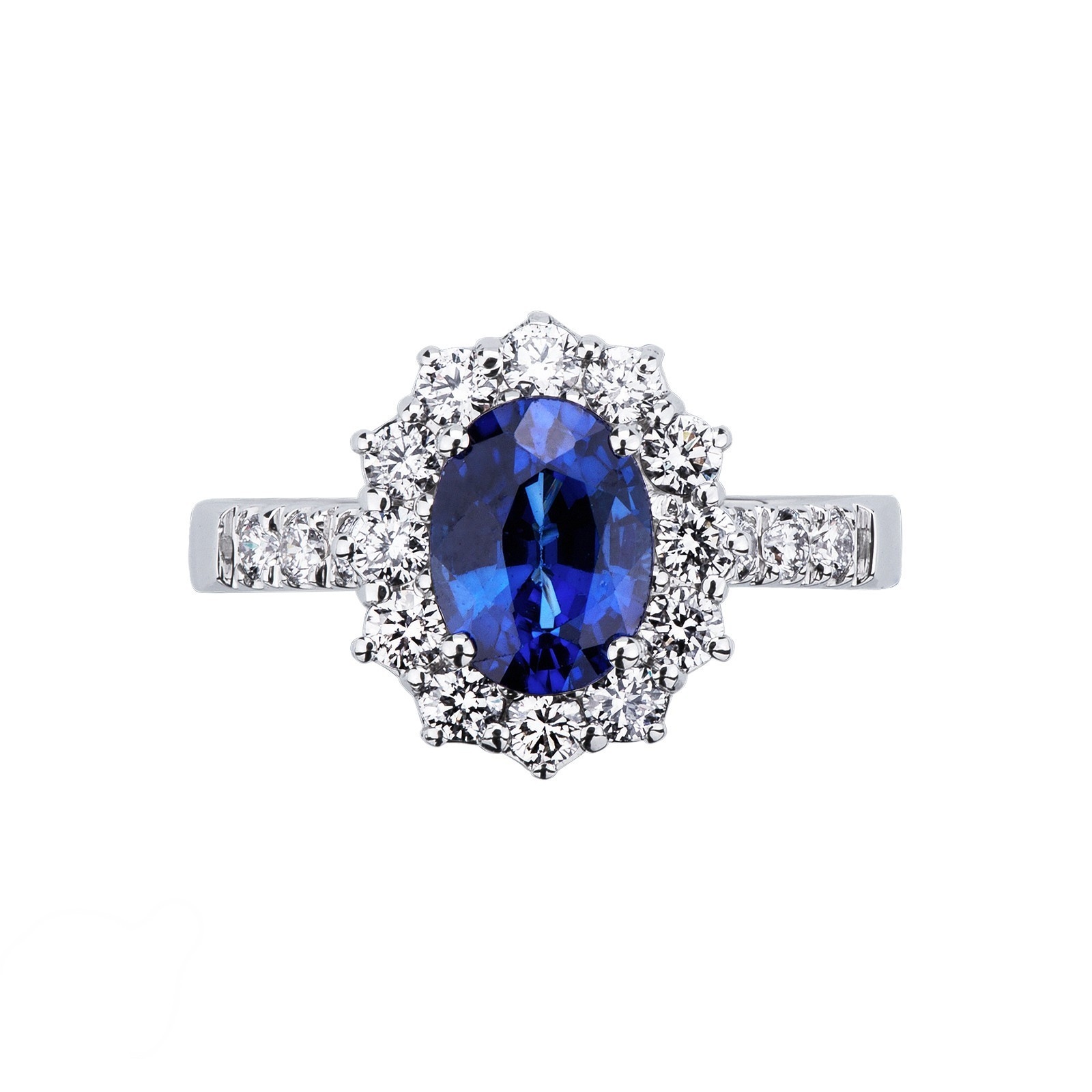 Bague Lady Di en or blanc 18k avec saphir bleu et diamants