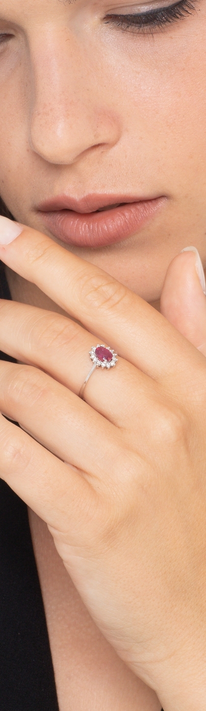 Bague rubis de taille ovale entouré de diamants de taille brillant de couleur H et de pureté VS. Le rubis mesure environ 6x4 mm.