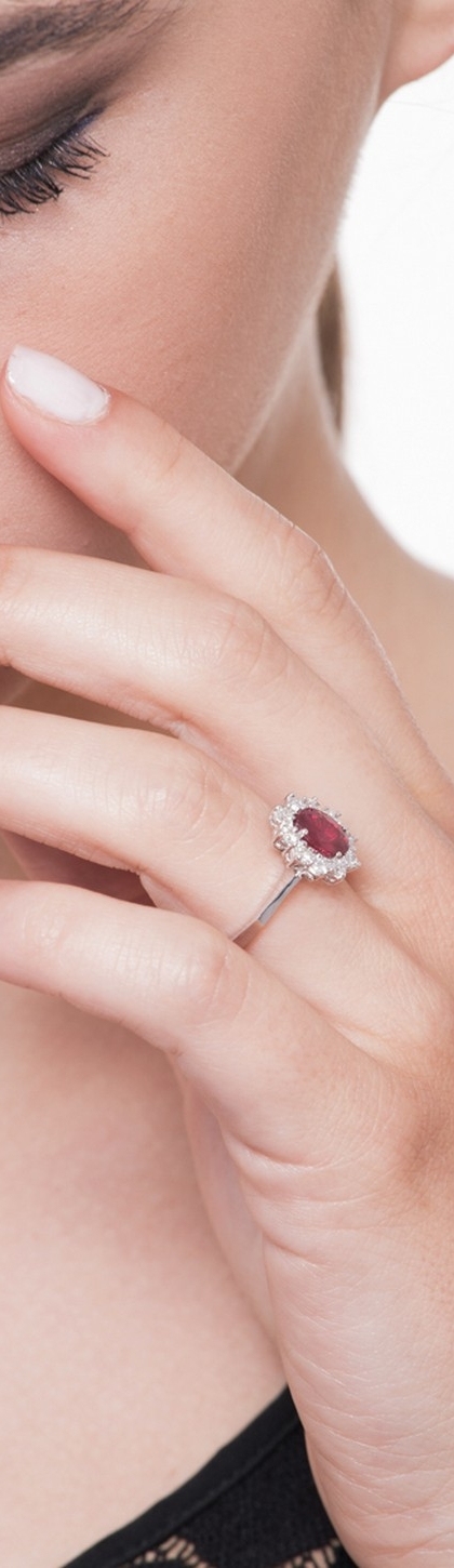 Bague rubis ovale et halo de diamants en or blanc 18k