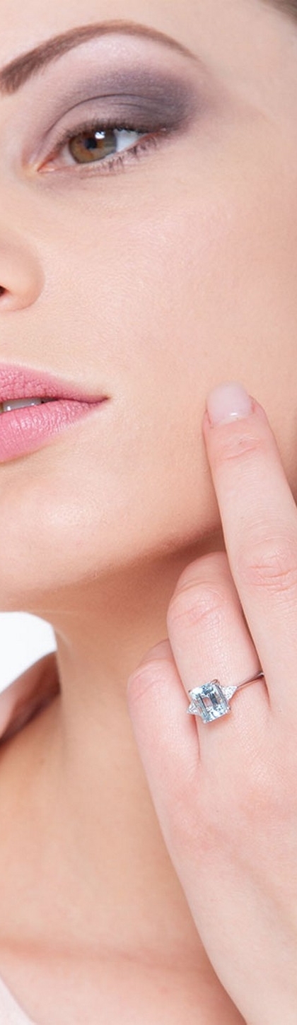 Élégante bague alliance en or blanc 18k avec aigue-marine centrale taille émeraude et diamants latéraux taille brillante couleur H pureté Vs, idéale pour offrir ou porter lors d’occasions spéciales