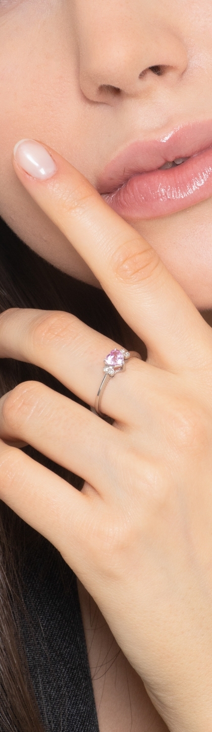 Bague en or blanc 18k avec saphir rose en forme de cœur et diamants.