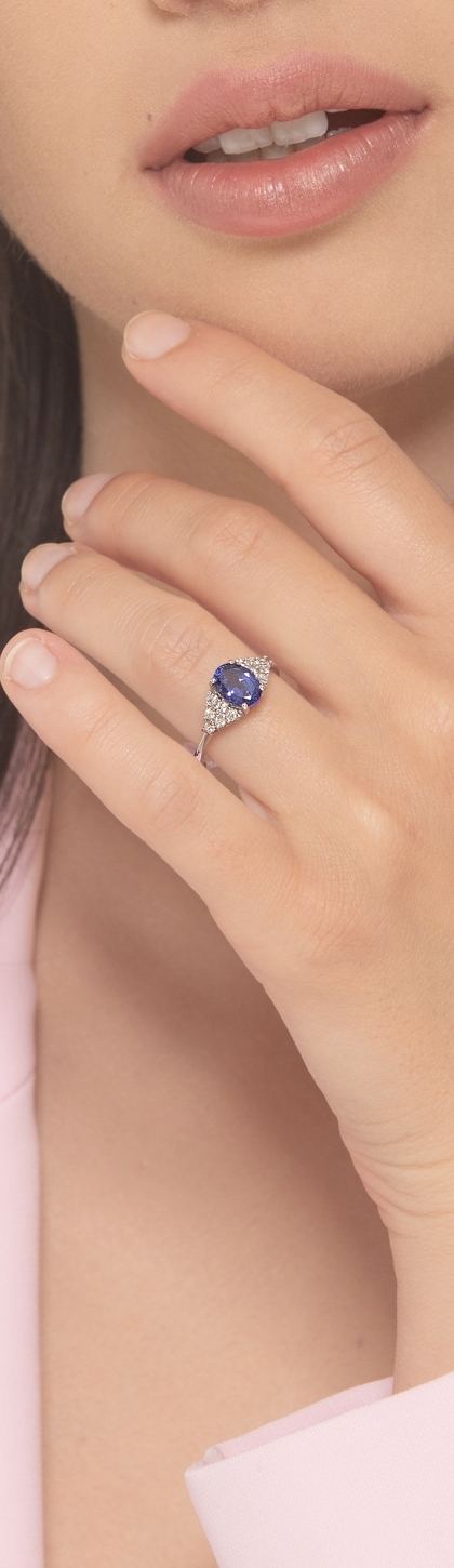 Bague en or blanc 18k avec tanzanite et 6 diamants de chaque côté disposés en triangle.