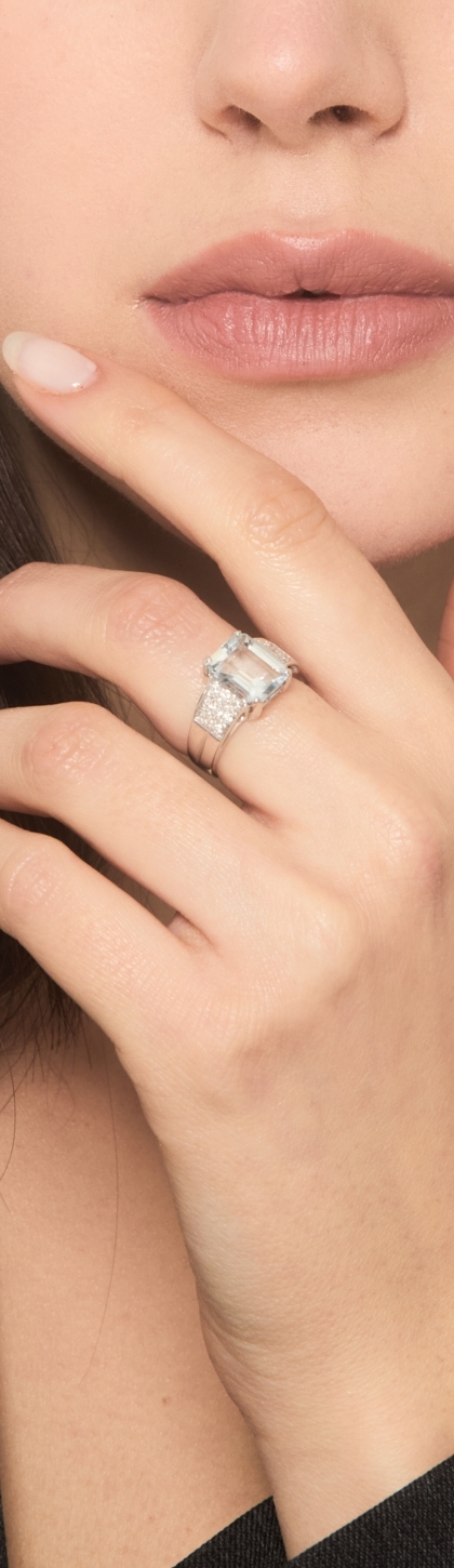 Bague en or blanc avec aiguemarine octogonale et diamants