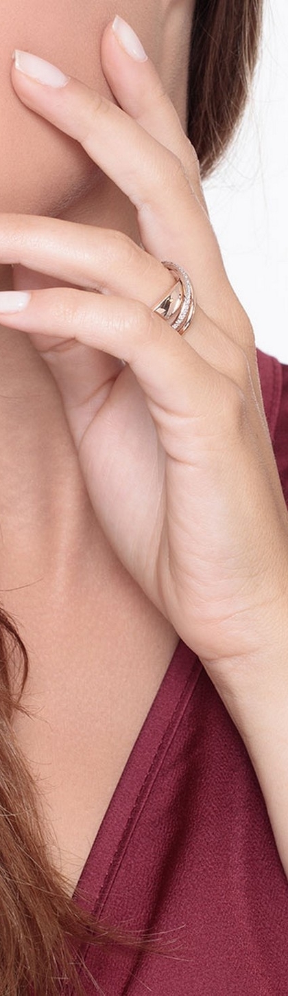 Bague en bande en or blanc et rose 18k avec des diamants sertis de taille brillant, couleur H et pureté VS. Bague avec deux bandes croisées lisses de différentes largeurs, l'une d'entre elles ornée de diamants
