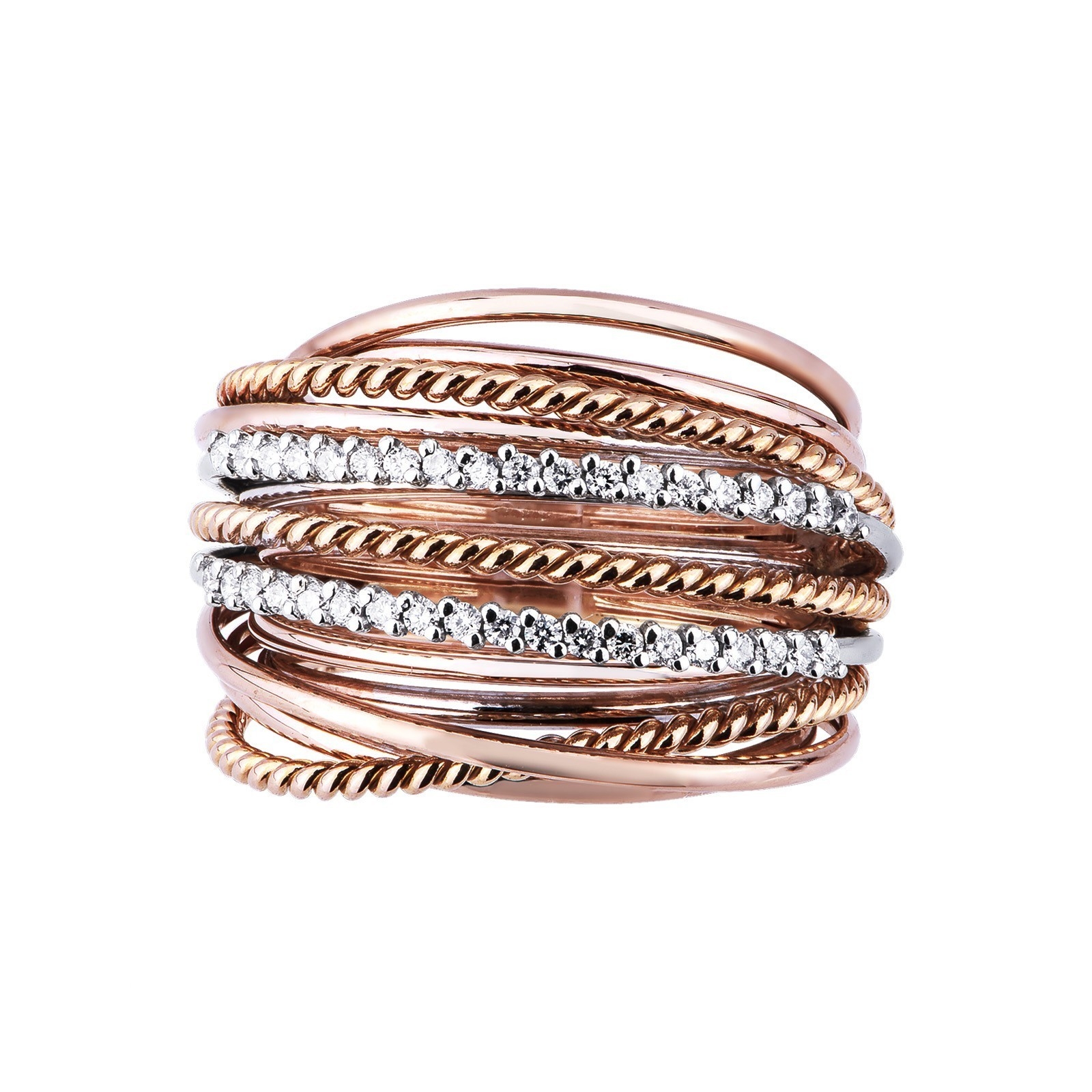 Bague à jonc pour femme en or blanc et rose 18 carats, sertie de diamants taille brillant de couleur G et pureté VS. Le design présente quinze fils entrelacés, avec les deux fils centraux sertis de diamants et trois fils travaillés style torsion, créant une bague fantaisie élégante et moderne. Largeur maximale de la bague : 17 mm.
