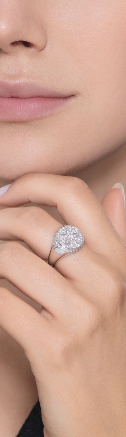 Bague chevalière en or blanc 18k avec étoile en relief sertie de diamants