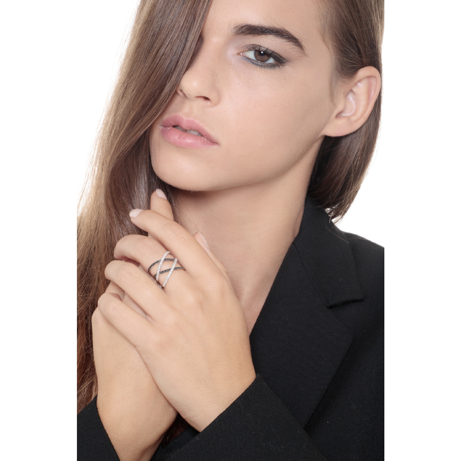 Bague croisée en or blanc 18k avec diamants blancs et noirs