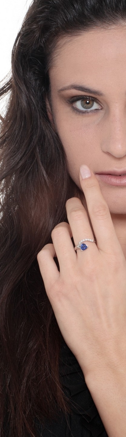 Bague design or blanc 18k avec un saphir bleu à cœur et rangée de diamants