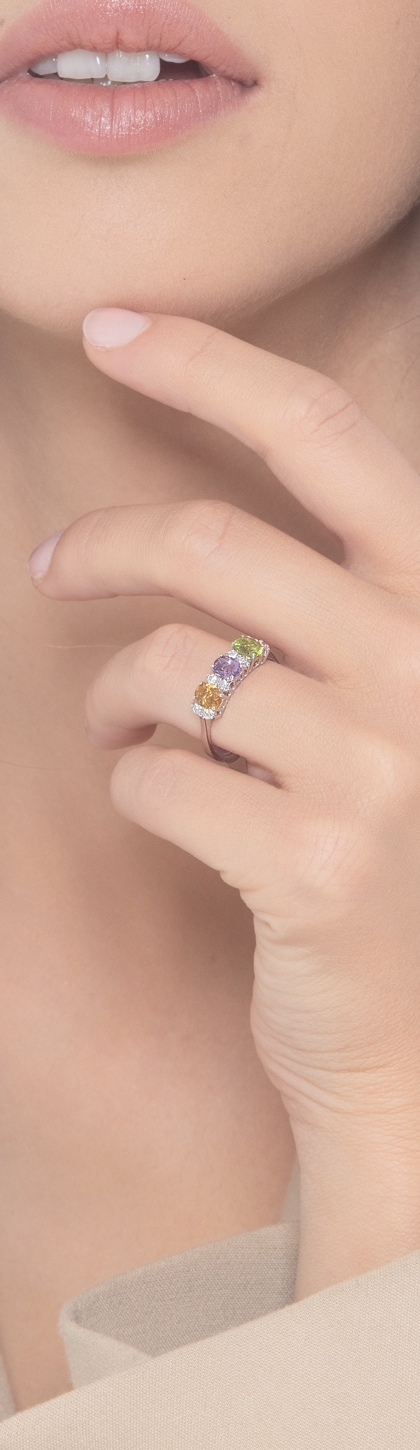 Bague en or blanc 18 carats avec citrine, améthyste, péridot et diamants