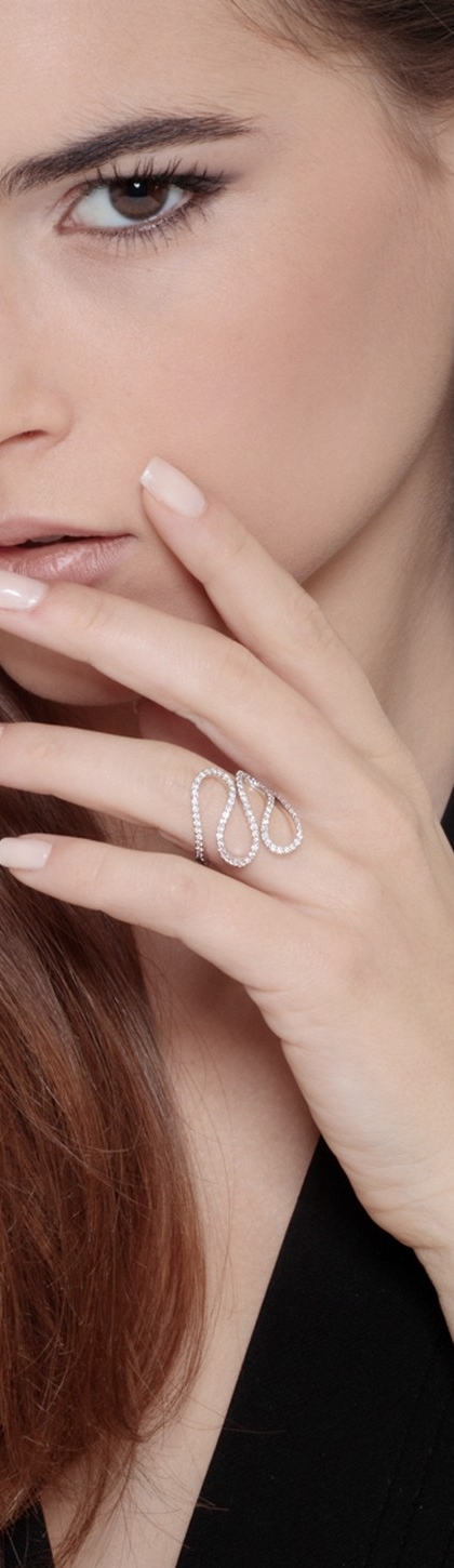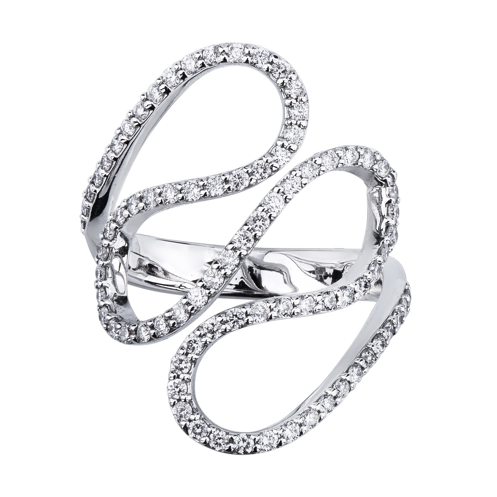 Bague en or blanc 18 carats avec design de lignes ondulées serties de diamants taille brillante couleur H et pureté VS. Un bijou féminin et raffiné qui allie élégance, mouvement et éclat, idéal pour celles et ceux qui recherchent une bague moderne et distinctive, parfaite au quotidien comme pour des occasions spéciales.